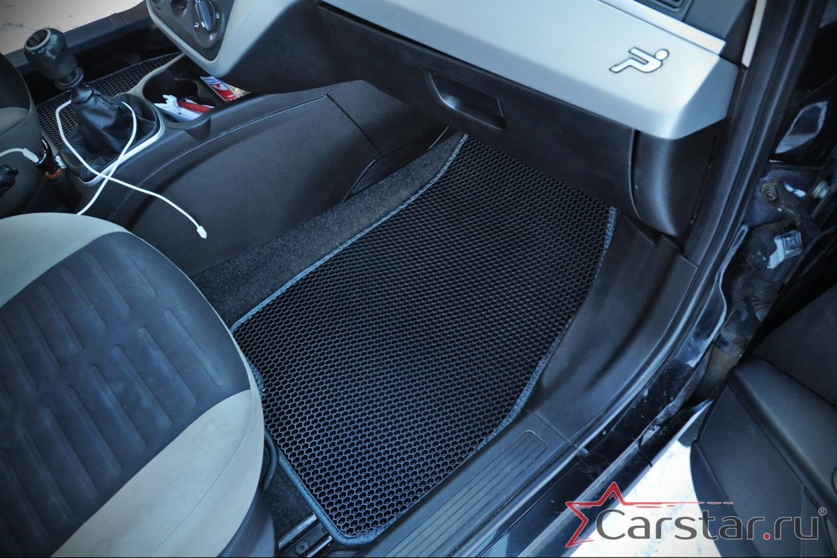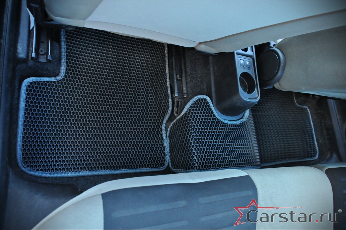 Толщина ковриков EVA составляет 10-12 мм. Глубина ячеек 7-8 мм. Такая толщина ковриков позволяет им служить довольно долго, не протираясь до 3 лет. А благодаря такой глубине ячеек коврик EVA площадью 1 кв.м. способен захватить около 3,5 л жидкости, сохраняя в чистоте вашу обувь и обивку салона.