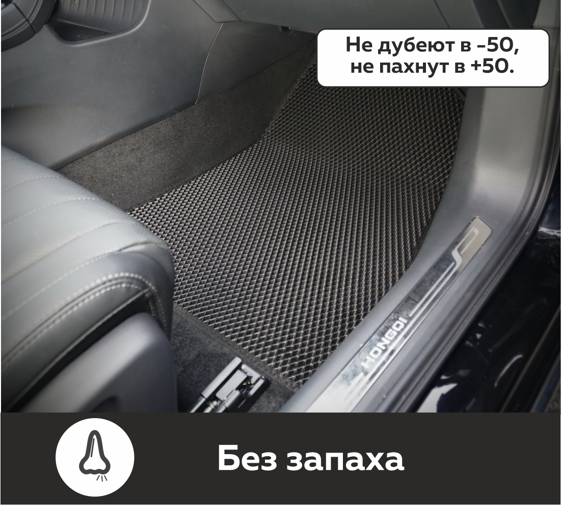 Изделия EVA имеют специальную ячеистую структуру (ячейки глубиной 8 мм), которая эффективно задерживает грязь и воду, оставляя вашу обувь и поверхность обивки салона или багажника абсолютно чистыми. Также эти ячейки очень легко и быстро очищаются без применения специальных инструментов, в том числе, при помощи бесконтактной мойки.