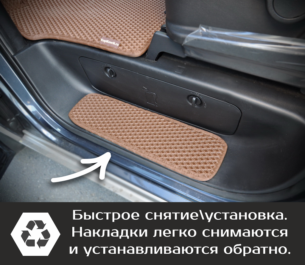 Накладки на пороги гармонично сочетаются с салонными ковриками EVA, дополняя друг друга.