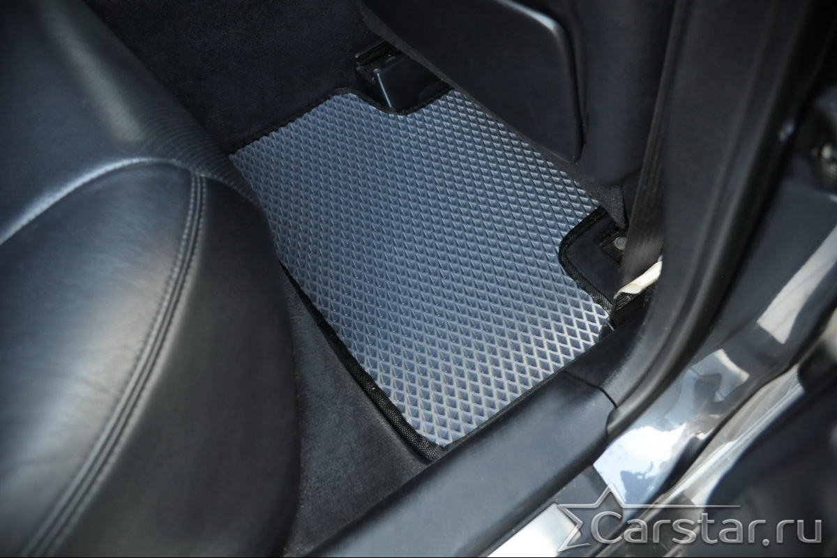 Толщина ковриков EVA составляет 10-12 мм. Глубина ячеек 7-8 мм. Такая толщина ковриков позволяет им служить довольно долго, не протираясь до 3 лет. А благодаря такой глубине ячеек коврик EVA площадью 1 кв.м. способен захватить около 3,5 л жидкости, сохраняя в чистоте вашу обувь и обивку салона.