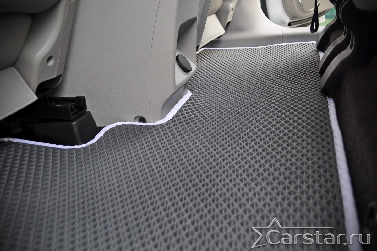 Толщина ковриков EVA составляет 10-12 мм. Глубина ячеек 7-8 мм. Такая толщина ковриков позволяет им служить довольно долго, не протираясь до 3 лет. А благодаря такой глубине ячеек коврик EVA площадью 1 кв.м. способен захватить около 3,5 л жидкости, сохраняя в чистоте вашу обувь и обивку салона.