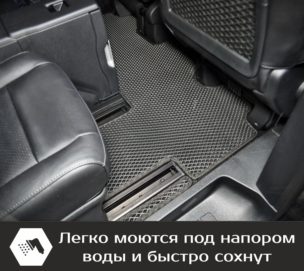 Изделия EVA имеют специальную ячеистую структуру (ячейки глубиной 8 мм), которая эффективно задерживает грязь и воду, оставляя вашу обувь и поверхность обивки салона или багажника абсолютно чистыми. Также эти ячейки очень легко и быстро очищаются без применения специальных инструментов, в том числе, при помощи бесконтактной мойки.
