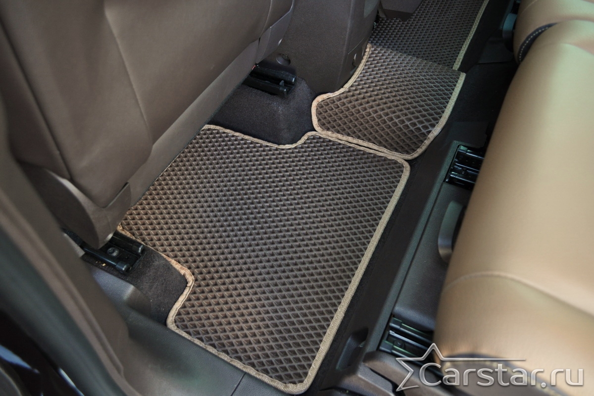 Толщина ковриков EVA составляет 10-12 мм. Глубина ячеек 7-8 мм. Такая толщина ковриков позволяет им служить довольно долго, не протираясь до 3 лет. А благодаря такой глубине ячеек коврик EVA площадью 1 кв.м. способен захватить около 3,5 л жидкости, сохраняя в чистоте вашу обувь и обивку салона.