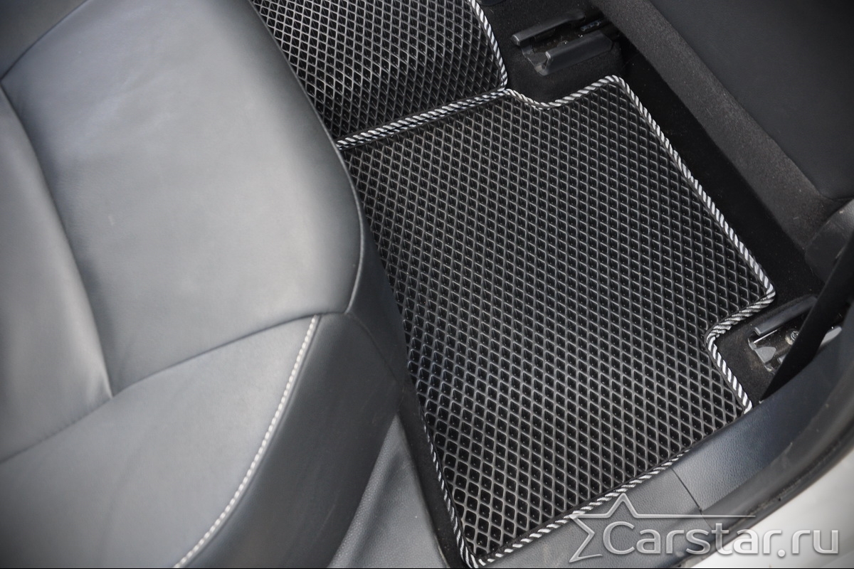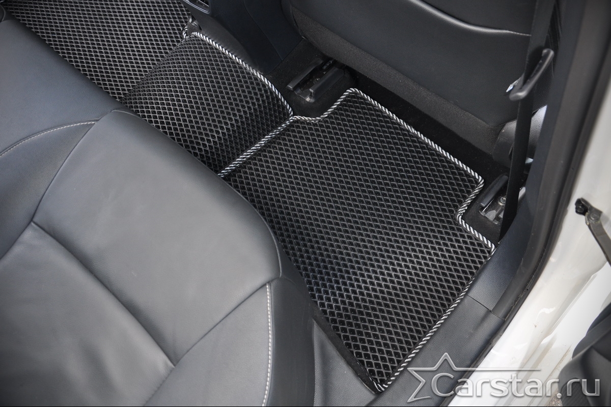 Толщина ковриков EVA составляет 10-12 мм. Глубина ячеек 7-8 мм. Такая толщина ковриков позволяет им служить довольно долго, не протираясь до 3 лет. А благодаря такой глубине ячеек коврик EVA площадью 1 кв.м. способен захватить около 3,5 л жидкости, сохраняя в чистоте вашу обувь и обивку салона.