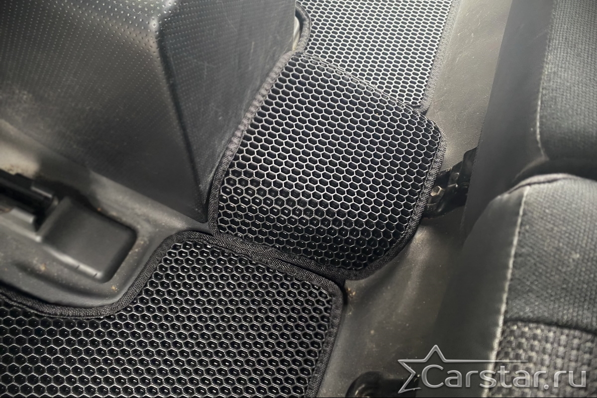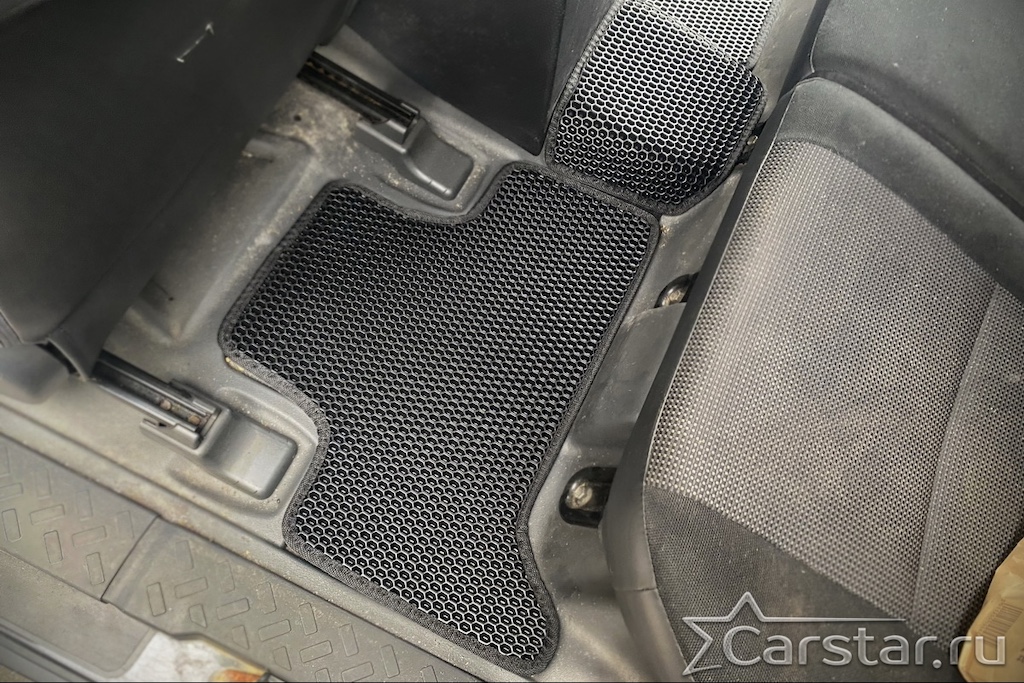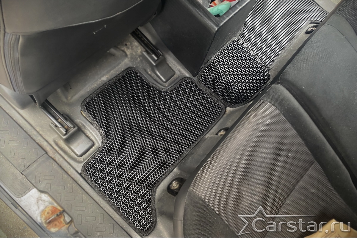 Толщина ковриков EVA составляет 10-12 мм. Глубина ячеек 7-8 мм. Такая толщина ковриков позволяет им служить довольно долго, не протираясь до 3 лет. А благодаря такой глубине ячеек коврик EVA площадью 1 кв.м. способен захватить около 3,5 л жидкости, сохраняя в чистоте вашу обувь и обивку салона.