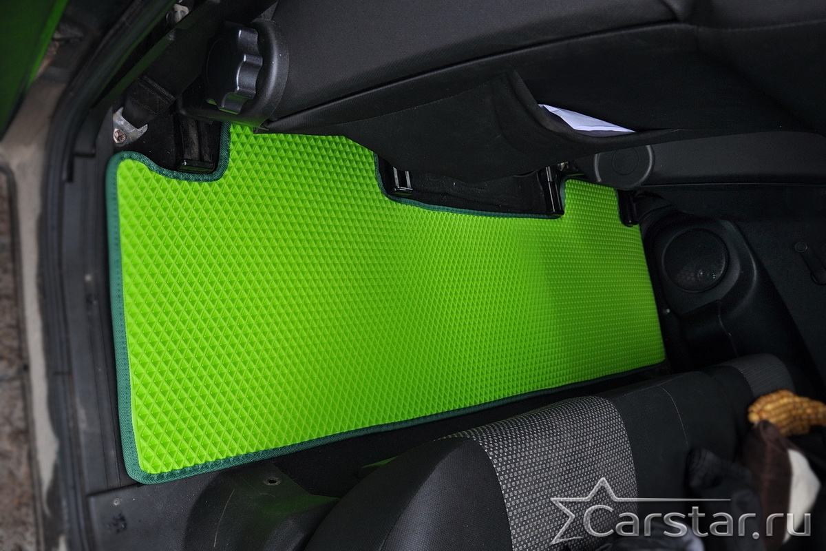 Толщина ковриков EVA составляет 10-12 мм. Глубина ячеек 7-8 мм. Такая толщина ковриков позволяет им служить довольно долго, не протираясь до 3 лет. А благодаря такой глубине ячеек коврик EVA площадью 1 кв.м. способен захватить около 3,5 л жидкости, сохраняя в чистоте вашу обувь и обивку салона.