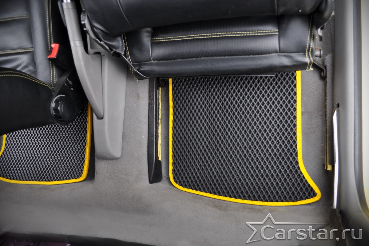 Толщина ковриков EVA составляет 10-12 мм. Глубина ячеек 7-8 мм. Такая толщина ковриков позволяет им служить довольно долго, не протираясь до 3 лет. А благодаря такой глубине ячеек коврик EVA площадью 1 кв.м. способен захватить около 3,5 л жидкости, сохраняя в чистоте вашу обувь и обивку салона.